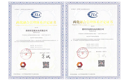 2020年11月和2021年2月,福建省電子信息集團(tuán)下屬企業(yè),國(guó)企上市公司控股 ( 證券代碼:600203)公司:惠州市邁銳光電有限公司和深圳市邁銳光電有限公司分別獲得了工信部?jī)苫诤瞎芾眢w系評(píng)定證書(shū)。