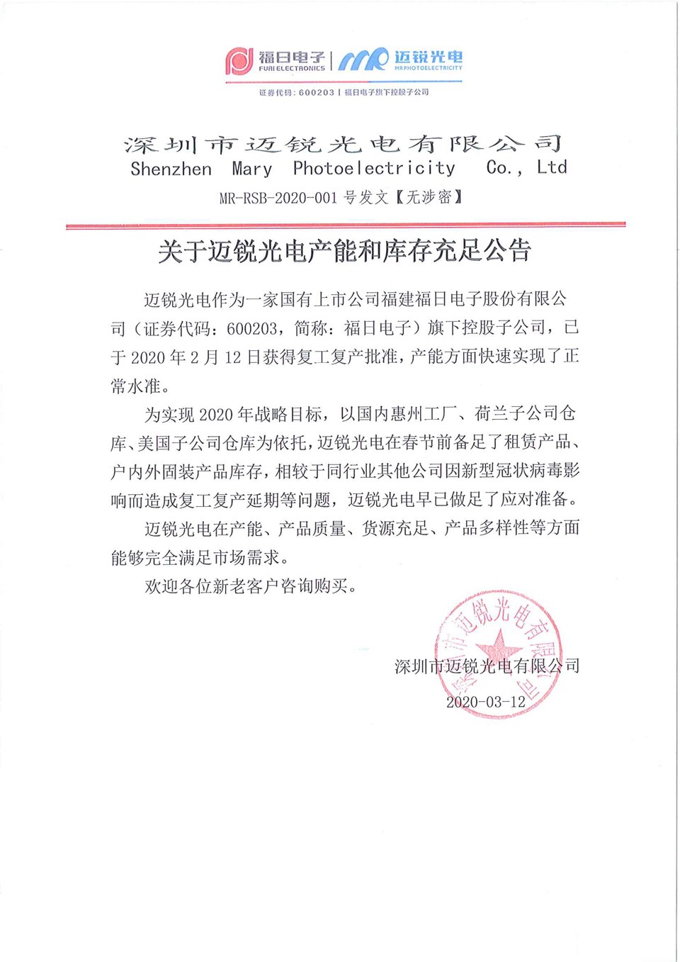 因新型冠狀病毒影響而造成了復(fù)產(chǎn)延期等問題,邁銳光電早已做足了應(yīng)對準備。公司在惠州有大型研發(fā)基地,標準化生產(chǎn)管理,高效的生產(chǎn)力,擁有完美的LED生產(chǎn)生態(tài)鏈,在產(chǎn)能質(zhì)量和產(chǎn)品多樣性等方面完全滿足市場需求。