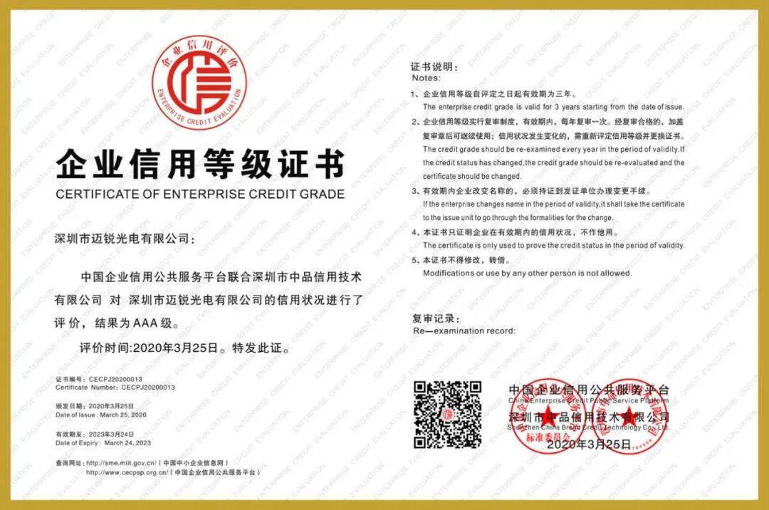 近日,通過中國企業(yè)信用公共服務(wù)平臺和深圳市中品信用技術(shù)有限公司的評估,邁銳光電二次獲得AAA級信用企業(yè)證書-信用程度高,合同履約能力強,具有優(yōu)秀的信用紀錄,經(jīng)營狀況佳,盈利能力強,發(fā)展前景廣闊。