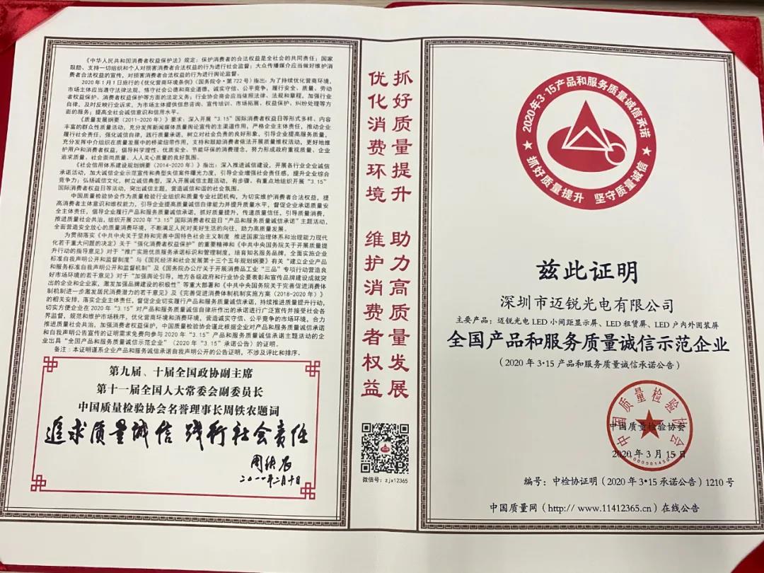 邁銳光電繼榮獲“建筑業(yè)企業(yè)資質(zhì)”證書后,再次斬獲中國質(zhì)量檢驗協(xié)會頒發(fā)的“全國產(chǎn)品和服務(wù)質(zhì)量誠信示范企業(yè)”“全國LED顯示屏行業(yè)質(zhì)量領(lǐng)先企業(yè)”證明。
