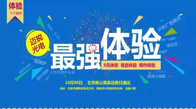 10月30日,以“十年載譽·新品呈鑒”為主題的邁銳光電十城感恩巡展暨新品推介會將在北京新云南皇冠假日酒店隆重舉行。屆時,邁銳光電將聯(lián)袂國星光電、日月成科技、諾瓦電子、視誠科技四大戰(zhàn)略伙伴,邀請各大客戶、渠道商、集成商、媒體朋友、行業(yè)同仁共聚一堂,為大家奉上本年度市場與技術(shù)方面最前沿、最實用的LED視聽盛宴。