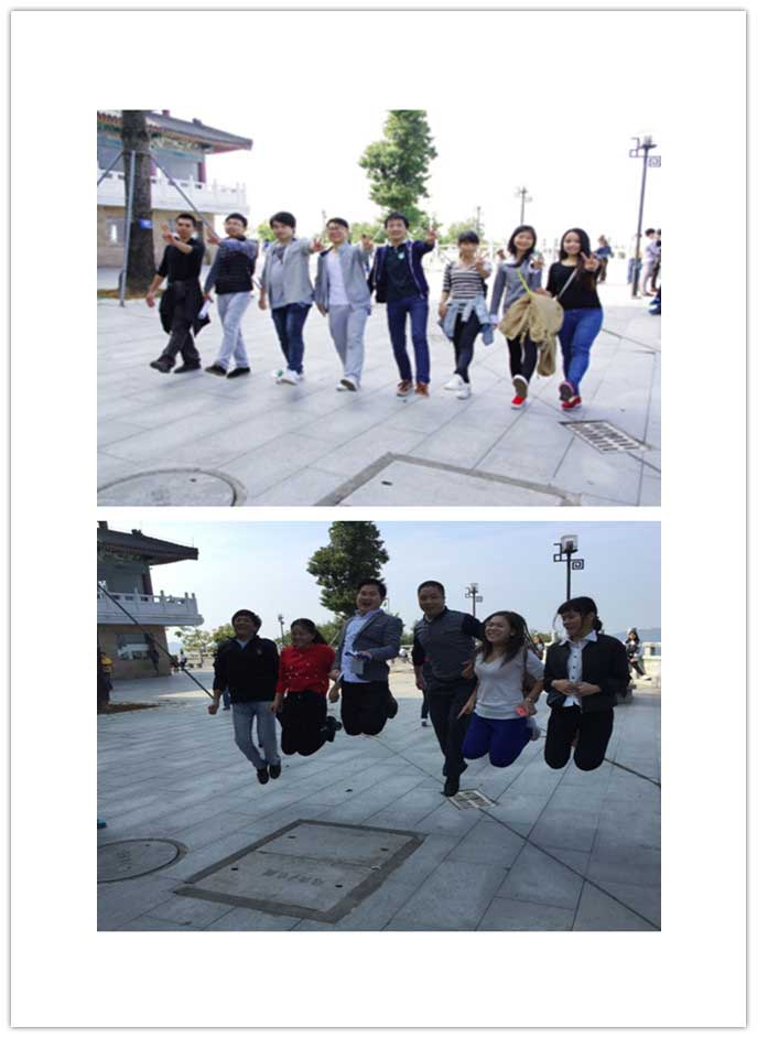 這一次爬山活動我們一改往常比快獲獎的形式,改為最晚到達(dá)的小組將獲得節(jié)目表演的機(jī)會。短暫休息之后,最晚達(dá)到的小組為大家邊唱邊跳的表演了《兩只老虎》。期間以小組為單位的進(jìn)行了豐富多彩的活動活動:如小組人員合唱,以登山為主題的或帶有山字的歌曲2首;尋找2名年齡5-10歲的小朋友,小組成員為他們唱2首兒童歌曲,直到小朋友點(diǎn)贊為止;任選隊里一男一女10分鐘到達(dá)掛榜閣6樓,并合唱《你是風(fēng)兒,我是沙》;1分鐘內(nèi),尋找一名長發(fā)女性路人大聲說我愛你,然后奔跑回原點(diǎn);小組成員完成:全員腳離地,眼睛張開并露出牙齒的合照等小組活動,活動還設(shè)置了多項(xiàng)獎勵,高漲的情緒一直縈繞,愉悅的笑容掛在每個人的臉上。全體員工合影后,陸陸續(xù)續(xù)的踏上了回家的征程,本次活動圓滿結(jié)束。