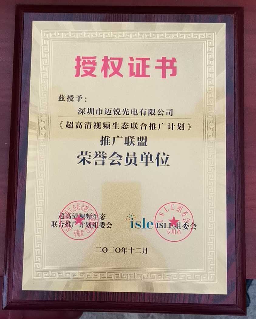 為了加快超高清產(chǎn)業(yè)發(fā)展和應(yīng)用普及,進(jìn)一步發(fā)揮項(xiàng)目平臺(tái)作用超高清視頻生態(tài)聯(lián)合推廣組委會(huì)同步與邁銳等14家企業(yè)組成戰(zhàn)略推廣聯(lián)盟,由組委會(huì)為首批會(huì)員企業(yè)授予榮譽(yù)會(huì)員單位資格證書。