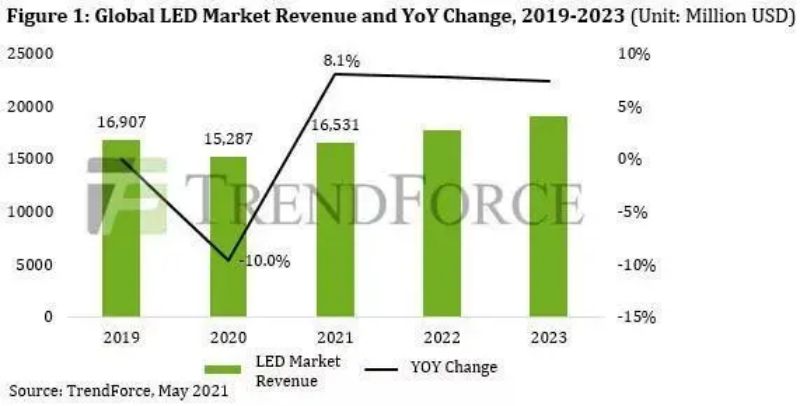 據(jù)集邦咨詢(TrendForce)全球 LED 市場調(diào)查報(bào)告數(shù)據(jù)顯示:預(yù)計(jì) 2021 年全球 LED 市場收入將達(dá)到 163.5 億美元,相比去年增長 8.1%,其中有一項(xiàng)增長就來自于戶外LED顯示屏。由此可見,戶外LED顯示屏的市場需求依然可觀。