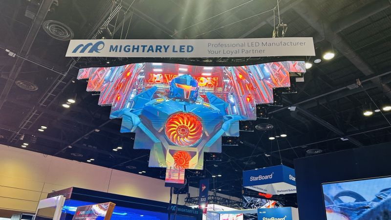 展位懸頂上方的變形金剛吸引了眾多來賓的眼球,倒三角吊裝的展示方式為其適用更多應用場景提供了解決方案,具備快速拆卸安裝,適配性強等高性能特點,讓舞臺顯示效果更精彩,獲得了眾多海內(nèi)外客戶青睞。