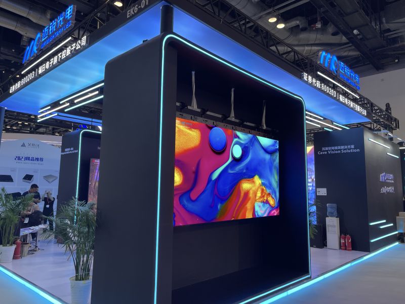 隨著技術(shù)的快速發(fā)展,人們對于顯示屏的要求從傳統(tǒng)的平面顯示轉(zhuǎn)向了立體、高清、互動的視覺感官體驗。此次展會,邁銳光電推出的沉浸式空間視效解決方案,采用四面體環(huán)形空間,結(jié)合裸眼3D視覺效果,給現(xiàn)場觀眾帶來了全新的沉浸式體驗。